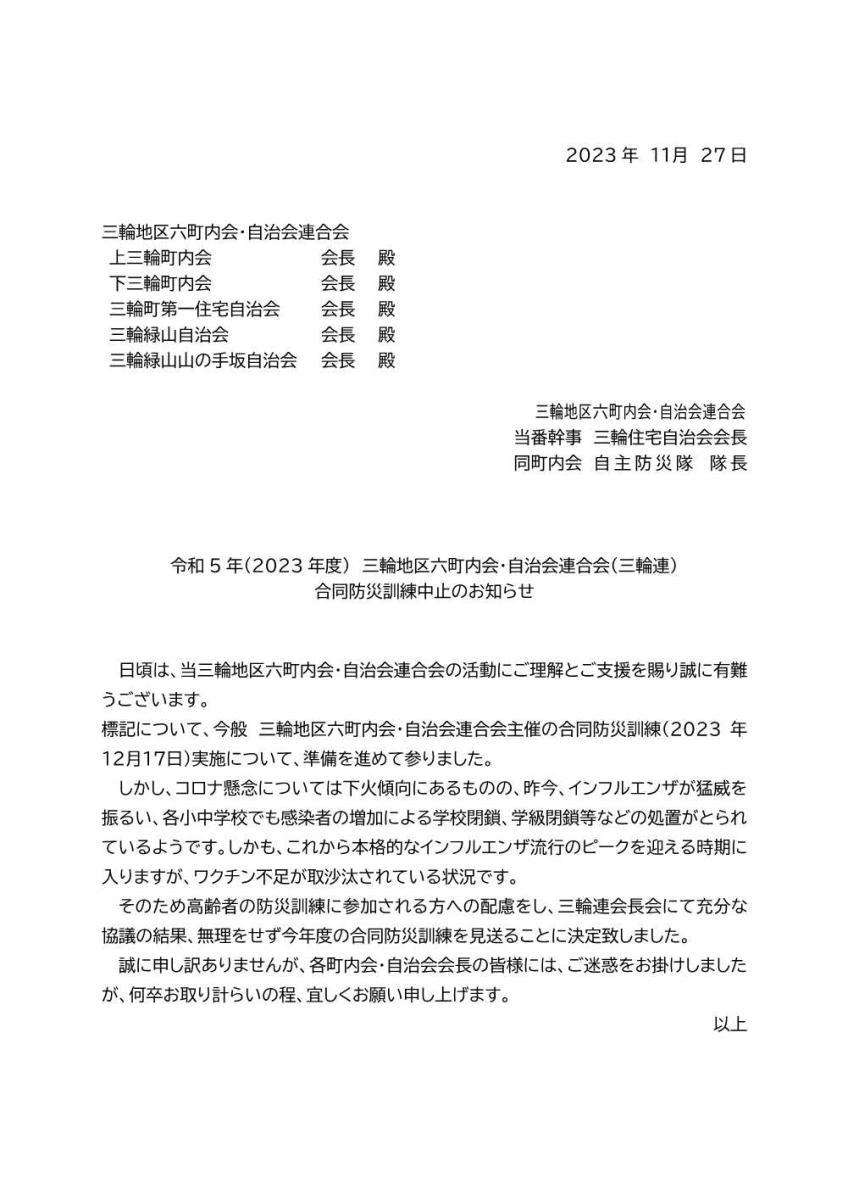 一覧へ 2023 三輪町内会・自治会連合会(三輪連) 防災訓練中止のお知らせ 投稿日時: 2023/11/27 自治会KDY 今年度、12月17日(日)に予定されていました「三輪連防災訓練」は、中止となりました。