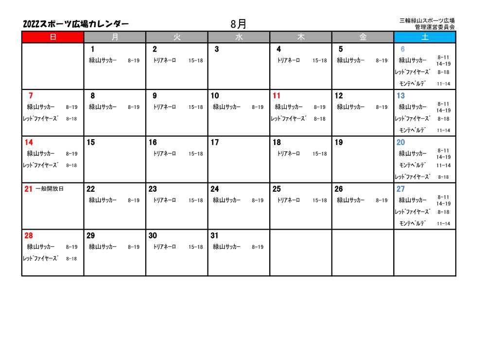 一覧へ 緑山スポーツ広場の利用状況 (2022年8月度) 投稿日時: 2022/07/24 自治会KDY 8月21日(日曜日)は、スポーツ広場の一般公開日です。 熱中症等の予防には、帽子、水分補給、日蔭などで適度な休息を取りながら、個々に注意してご利用ください。三輪緑山自治会/環境整備