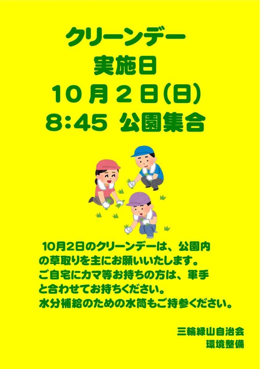 暑い日が続いていますが、皆様にはお変わりなくお過ごしのことと思います。標題の通り、クリーンデーを実施致します。コロナ禍ではあります。ご高齢の方や体調が少しでも思わしくない場合は、ご参加をお控えください。くれぐれもご無理のないよう、ご協力をお願い致します。