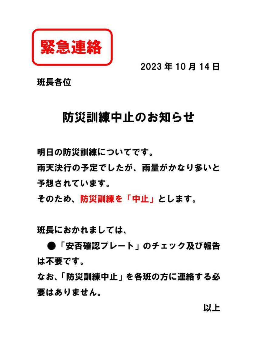 一覧へ 10/15 緑山防災訓練は中止です 投稿日時: 2023/10/14 自治会KDY 明日(10/15)の防災訓練は、雨量が多い予報が発令されております。 一般、参加の住民の方も、防災訓練は中止となりますので、ご了承ください。