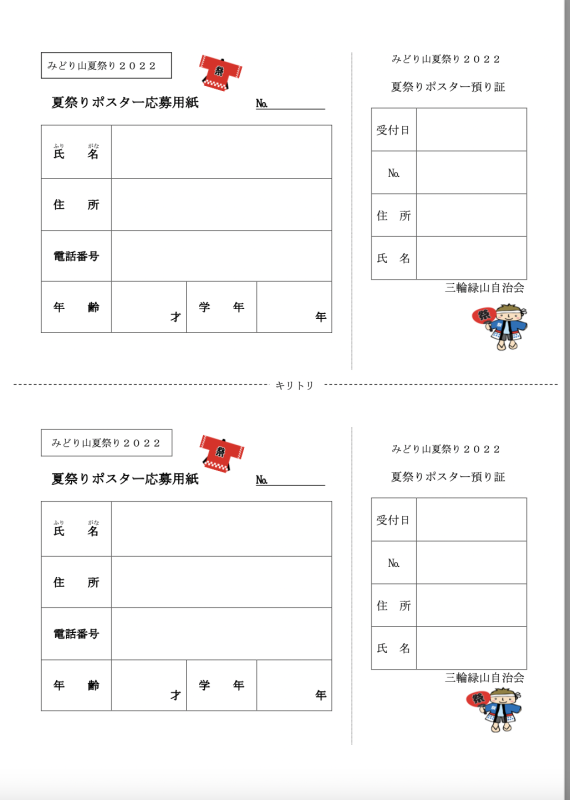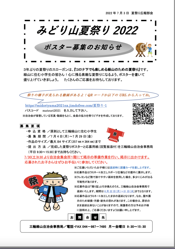 一覧へ 『みどり山夏祭り2022』のポスターを募集しています!! 投稿日時: 2022/07/03 自治会FKT 以下のようなポスター募集チラシを7月1回目の回覧で回しています。 奮ってご応募ください!! 当チラシは事務局にもありますので、必要な方はお問い合わせください。 三輪緑山自治会 / 広報