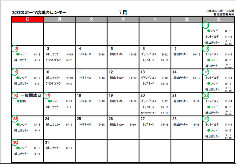 一覧へ 緑山スポーツ広場利用状況(7月) 投稿日時: 2023/07/10 OfficeFA 7月のスポーツ広場の利用カレンダーを掲載します。 7月20日(木)は、わくわくサマーナイトパトロールを17時より実施します。 2023.7月スポ広予約-.pdf