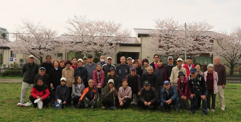 毎年この時期私達の気分をうきうきさせてくれるサクラは開花が遅れ、ようやく3月29日に開花宣言が出ると、美しいピンクの花を徐々に開き、緑山でも4月8日にはほぼ満開となりましたので、ラジオ体操終了後に参加者で記念撮影をしました。