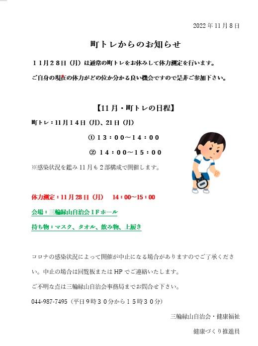 町トレ11月の予定変更(11月28日(月)は町トレをお休みして体力測定を行います)