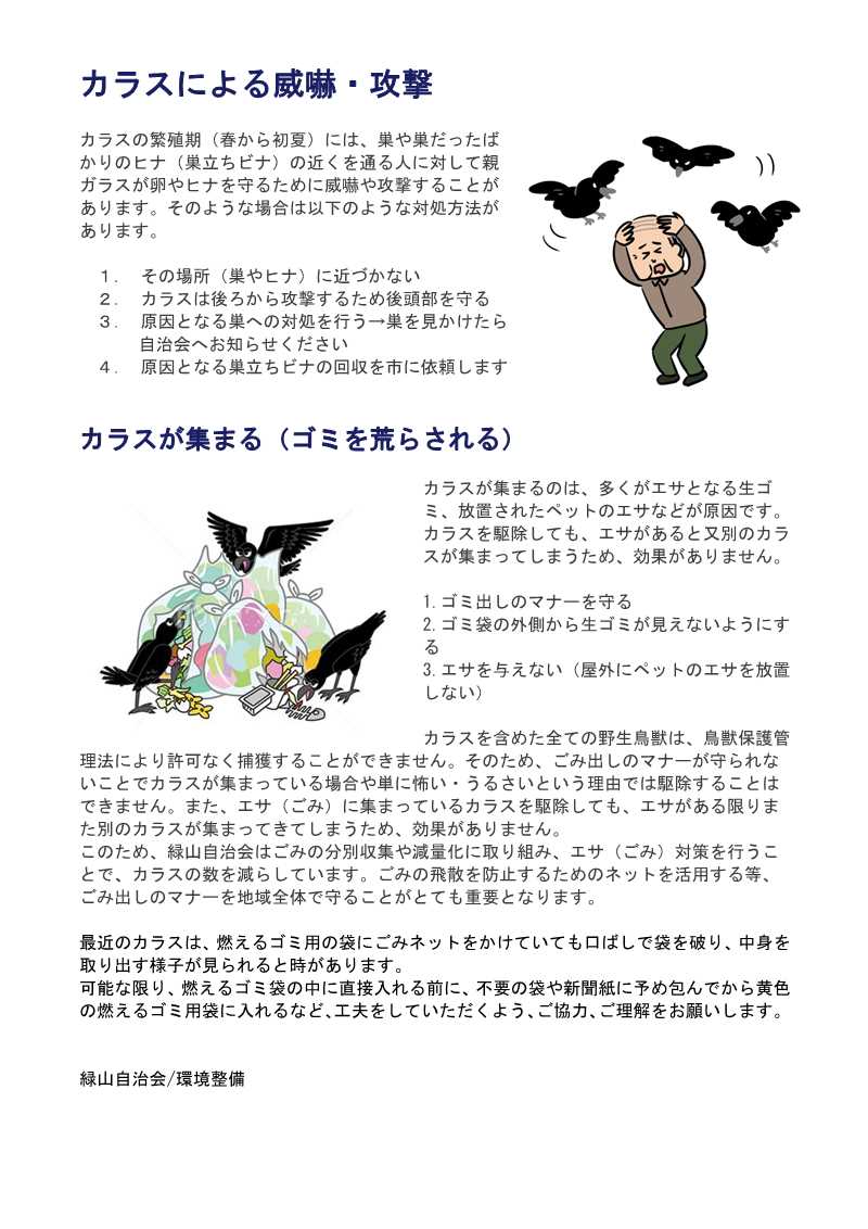 一覧へ カラスにご注意! 投稿日時: 2022/05/13 自治会KDY カラスにご注意ください。3~5月は、カラスの繫殖期間です。燃えるゴミ(黄色)を口ばしで破り、生ゴミ等を荒らす時期です。ヒナを育てている期間は、親カラスがエサを取るために威嚇や攻撃をすることもあります。