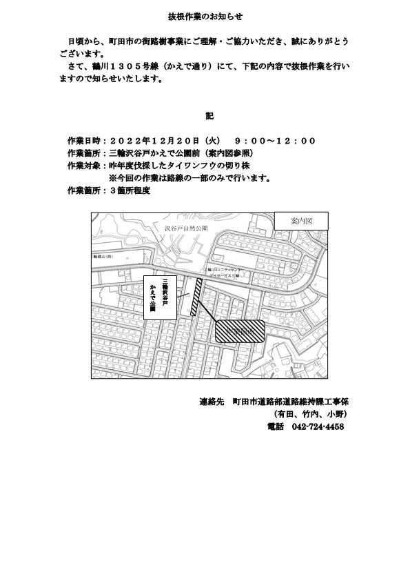 一覧へ かえで通り(かえで公園前)の街路樹数か所の伐根について(町田市からお知らせ) 投稿日時: 2022/12/16 自治会KDY 下記の日程で「かえで公園」前の街路樹(背丈1m)の伐根作業を街路樹整備のため、町田市が実施致します。詳細は下記のとおりです。