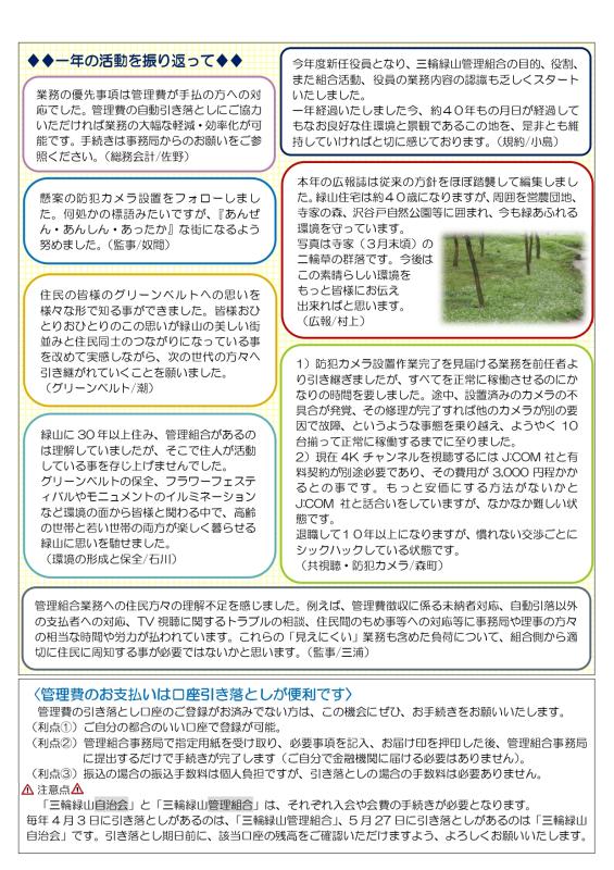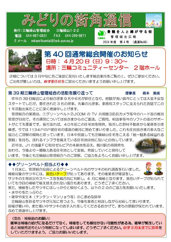 広報紙「みどりの街角通信」 全ての記事 全ての記事 アーカイブ 2025年12月 (0) 2025年11月 (0) 2025年10月 (0) 2025年9月 (0) 2025年8月 (0) 2025年7月 (0) 2025年6月 (0) 2025年5月 (0) 2025年4月 (0) 2025年3月 (1) 5件 1件 5件 10件 20件 50件 100件 広報紙第66号 投稿日時 : 03/06 管理組合O